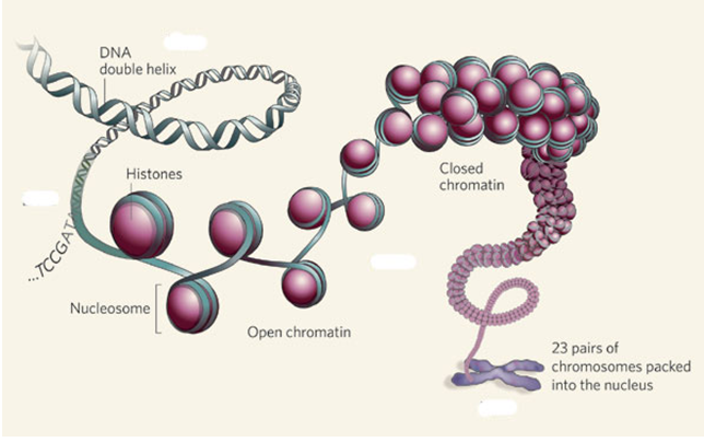 One must study the above from right to left. A packaged DNA (called Chromatin) is pulled out from one of the 26 chromosomes. The package is opened to reveal the opened out chromatin. (The objective in such packaging appears to be to reduce the 2 meter length to a size measurable in nanometers).