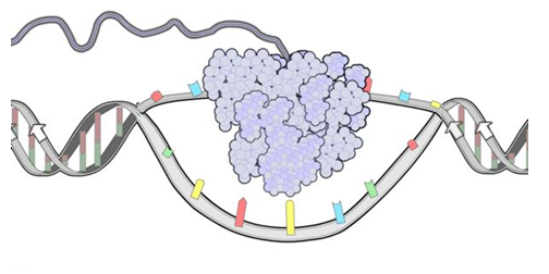The above shows a machinery (it is a group of molecules) reading out from the DNA the A’s, T’s, C’s and G’s (nucleotides) – after the DNA was uncoiled and the two strands were split. The strip coming out (top-left, darkened strip) is the mRNA.