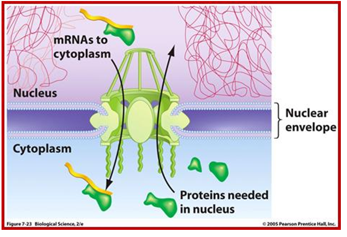 However, protein manufacture will not take place in the nucleus. So the RNA strip must be sent out into the cytoplasmic area around the nucleus. There are about 2000 pores (or gateways) in the nucleus membrane through which alone material can go in and out.However, no material can leave out without a chemical ‘exit-permit.’ The exit-permit is provided by membrane proteins. (Lifelines, p.128)