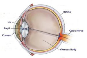 The in-coming light from an object first passes through the transparent front part of the eye called Cornea. The major task of focusing on objects is done by the cornea; the rest by the lens. Pupil is the black round hole in the center of the eye. Iris is the colored circle that surrounds the pupil. It controls the amount of light that will enter through the pupil. The iris regulates the size of the pupil controlling how much light will be allowed to go through. Passing through the pupil light strikes the lens. From there it is focused on to the retina. The retina contains many photoreceptor cells that convert light into electric signals. These signals are processed further and then the processed message travels through the optic nerve heading to the brain which actually interprets the electric signals into images.