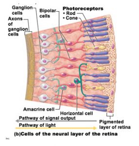 One may think of the information flow through the retina as following two paths: a direct path, from light receptors to bipolar cells to ganglion cells, and an indirect path, in which horizontal cells may be interposed between the receptors and bipolar, and amacrine cells between bipolar and retinal ganglion cells.