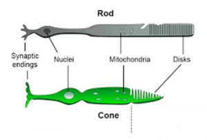 The cells at the back of the retina have rods and cones which are light receptors. Rods are far more numerous than cones. They are responsible for vision in dim light. Cones are responsible for observing the fine detail and for color vision. Both are in millions. In the very center, there are only cones. This area is about half a millimeter in diameter.
