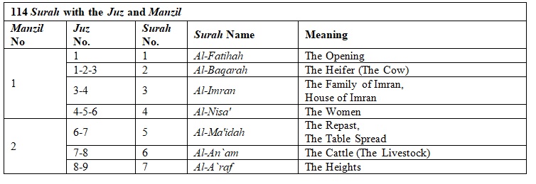 Scholars after the Prophet (peace be upon him) have done additional division of the Holy Qur’an for the convenience of recitation of the whole Qur’an in a set period like one week or one month. The seven approximately equal divisions are called Manzils or stations.
