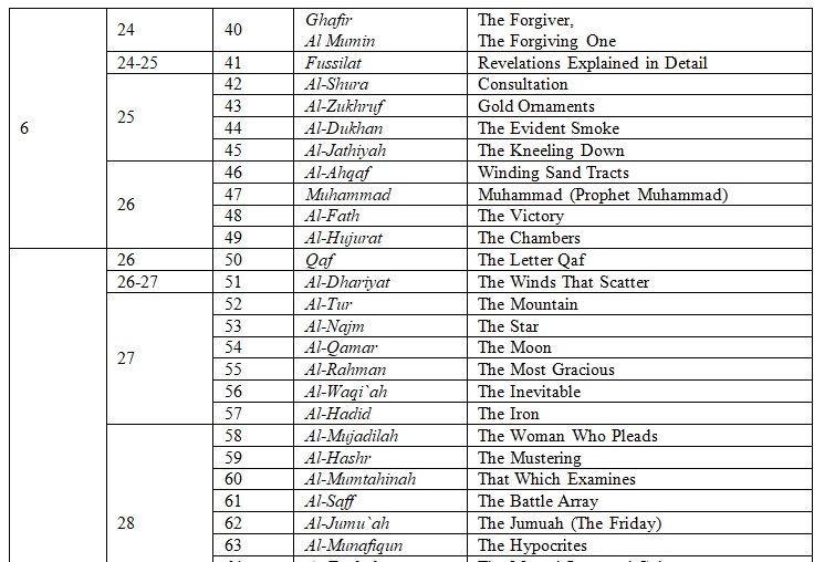 The Holy Qur’an was revealed in the auspicious month of Ramadan. This auspicious month is marked with Siyam (fasting) and special Salaat (prayers) namely the Tarawih Salaat. For many of us who do not know the Holy Qur’an by heart, find it difficult to follow the Tarawih: both its contents and meaning. Some information about the organization of the Qur’an can assist us in following the Tarawih. This short note is an attempt to familiarize us with the organization of the Holy Qur’an.