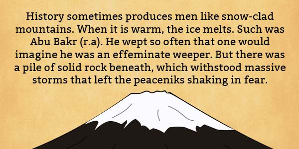 History sometimes produces men like snow-clad mountains. When it is warm, the ice melts. Such was Abu Bakr. He wept so often that one would imagine he was an effeminate weeper. But anyone who thought in those terms was misled by the snow that covered the mountain. There was a pile of solid rock beneath that withstood massive storm that left the peaceniks shaking in fear.